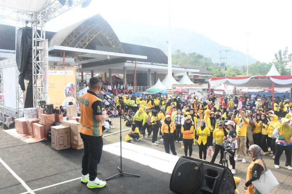 Ribuan warga Kabupaten Sukabumi memadati Lapangan Cangehgar Palabuhanratu, Minggu (28/9/2025). Mereka antusias mengikuti rangkaian kegiatan Car Free Day, Senam Gurilaps, dan Jalan Santai dalam rangka Hari Jadi Kabupaten Sukabumi ke-155.Acara ini dihadiri oleh Wakil Bupati Sukabumi H Andreas,